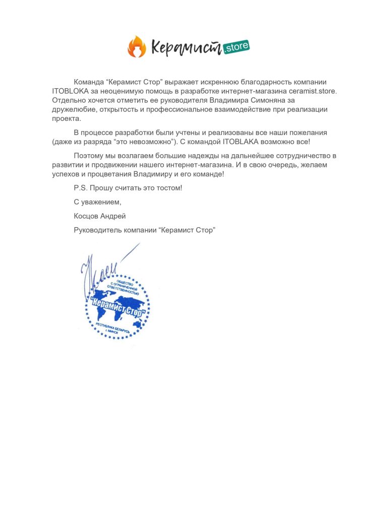 Команда “Керамист Стор” выражает искреннюю благодарность компании ITOBLAKA за неоценимую помощь в разработке интернет-магазина ceramist.store.