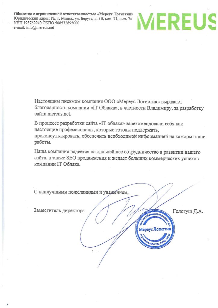 Настоящим письмом компания ООО «Мереус Логистик» выражает благодарность компании «IT Облака», в частности Владимиру, за разработку сайта mereus.net.