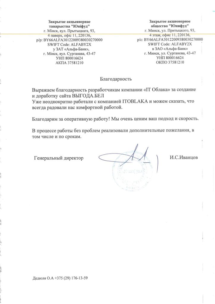 Выражаем благодарность разработчикам компании «IТ Облака» за создание и доработку сайта ВЫГОДА.БЕЛ.