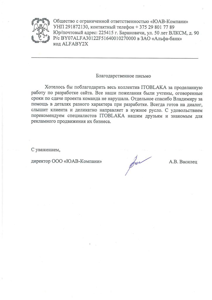 Хотелось бы поблагодарить весь коллектив ITOBLAKA за проделанную работу по разработке сайта. Все наши пожелания были учтены, оговоренные сроки по сдаче…